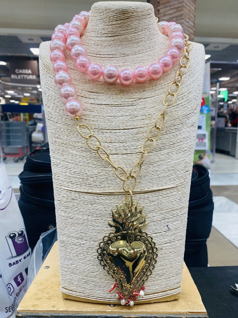 Collana in alluminio e perle sintetiche rosa con cuore sacro in acciaio smaltato.